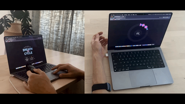 Breath Cycle is a webcam-based breath biofeedback system that can be accessed on any browser. In an effort to make breath-centered meditation more accessible to all, the system's default mode syncs dynamic text, shapes and colors to the user's breathing. At the center of the screen, quotes from from Thich Nhat Hanh's commentary on the Anapanasati Sutra invite the user to follow their inhalations and exhalations while procedurally generated graphics coincide with this movement. Along an outer circle, a radial graph grows complete through the duration of the session, displaying the user’s breathing waveform over time. The contour of the graph and its coloring are modulated by the breath signal, forming a unique visualization every time. The resulting shape can be saved as a .jpeg at the end of the breath cycle session. In addition to the default mode, the system includes two other modes. In the Breath Affirmation AI mode, the system allows users to type in any intention and have a GPT-generated meditation unfold as they breathe in and out. In the Coherence Trainer mode, the user can connect any Bluetooth Low Energy Compliant HRV monitor and have a breath pacer and a percentage coherence score at the center of the screen.